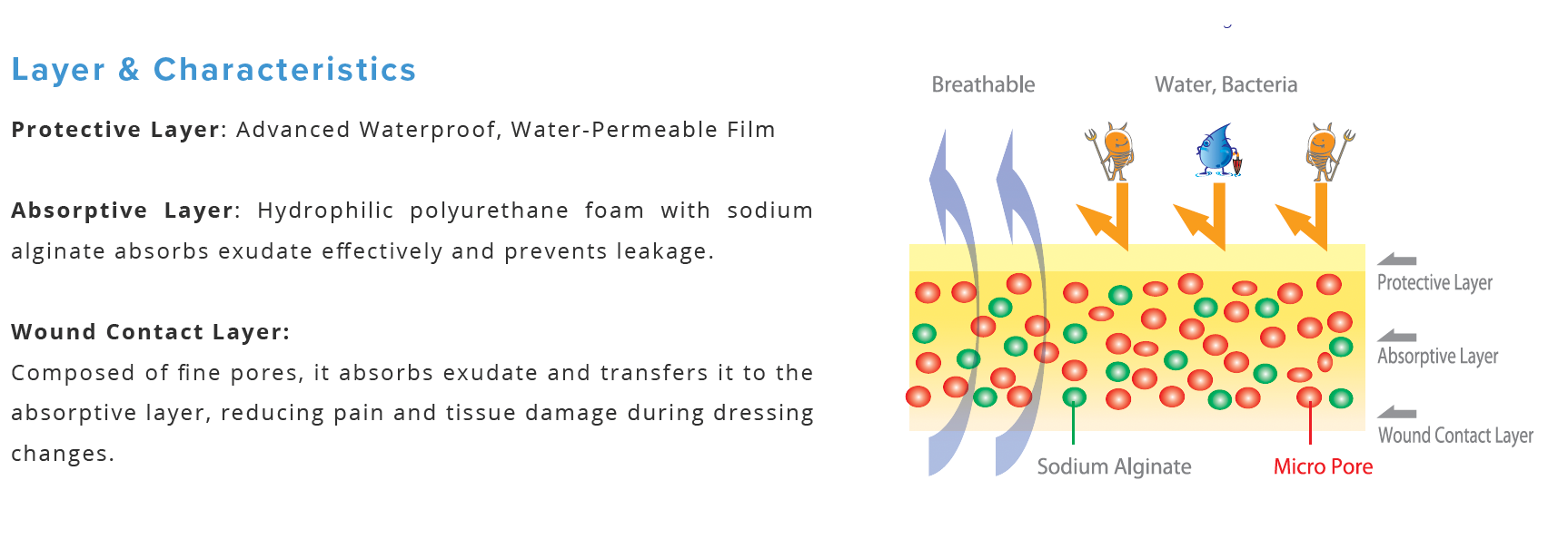Experience the best of both worlds with our innovative dressing, combining the superior features of Alginate and polyurethane foam dressings. Our product incorporates Sodium Alginate, offering exceptional absorption of wound exudate while maintaining optimal humidity and a moist environment that prevents scab formation. Unlike traditional alginate dressings, our easy-to-change design ensures no residue is left behind, making wound care simpler.